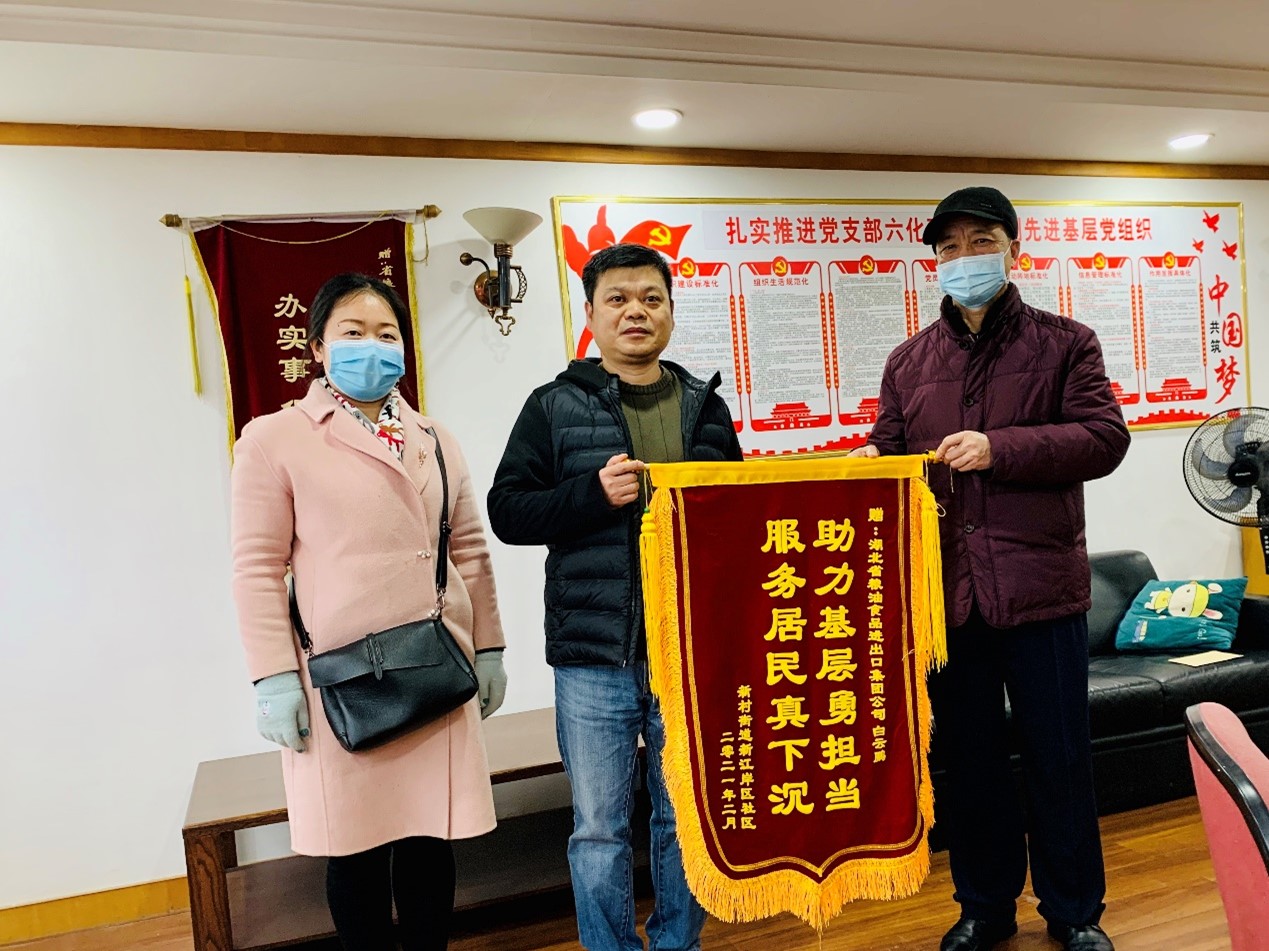 2月4日,新江岸社區黨委將感謝信和錦旗送到了糧油集團黨委委員、副總經理全國紅的手中,感謝糧油集團黨委對黨員下沉社區工作的支持,并對機關支部黨員白云鵬同志參與社區治理、投身社區建設表示感謝。