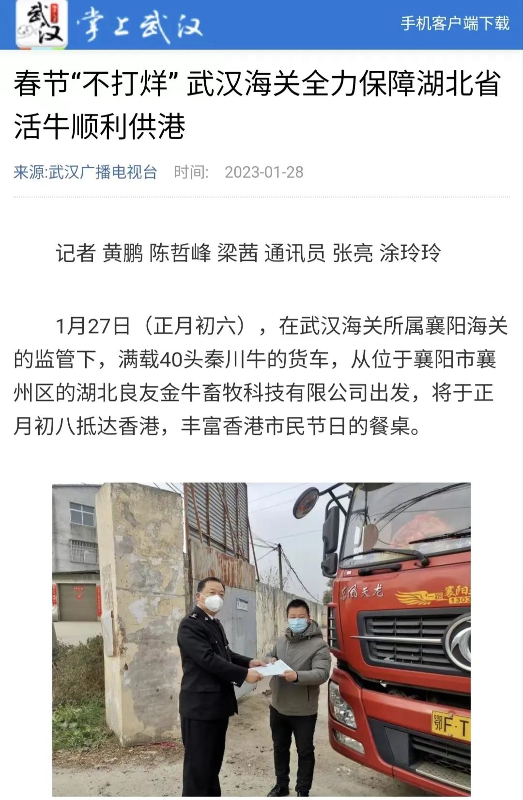 1月27日(正月初六),在武漢海關所屬襄陽海關的監管下,滿載40頭秦川牛的貨車,從位于襄陽市襄州區的湖北良友金牛畜牧科技有限公司出發,將于正月初八抵達香港,豐富香港市民節日的餐桌。